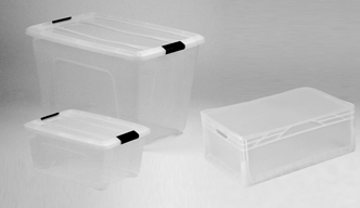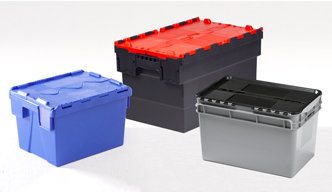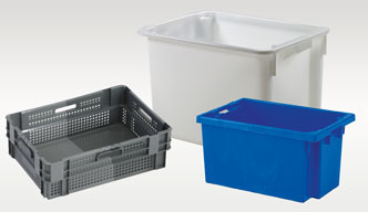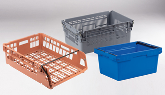 - Dekselkisten / distributiebakken: stapelbaar op gedeelde scharnierende deksels. In gesloten toestand haken de dekselhelften in elkaar (dat wordt ook wel krokodillenbek vorm genoemd). In open toestand hangen de deksels strak naast de plastic bak en zijn ze onderling nestbaar